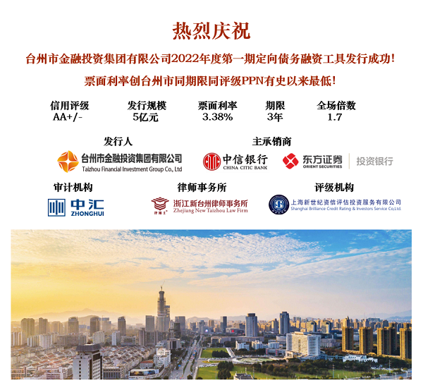 5月30日,臺(tái)州市金融投資集團(tuán)有限公司(以下簡(jiǎn)稱市金投集團(tuán))首單非公開定向債務(wù)融資工具(PPN)成功發(fā)行。發(fā)行金額5億元,期限3年,票面利率3.38%,由中信銀行與東方證券聯(lián)合承銷,全場(chǎng)認(rèn)購(gòu)倍數(shù)1.7倍。市金投集團(tuán)持續(xù)關(guān)注市場(chǎng)動(dòng)態(tài),緊抓央行降準(zhǔn)和貸幣政策寬松窗口,在各中介機(jī)構(gòu)的支持和市場(chǎng)投資者的高度認(rèn)可下,本次PPN票面利率創(chuàng)臺(tái)州市同期限同評(píng)級(jí)PPN有史以來(lái)最低。