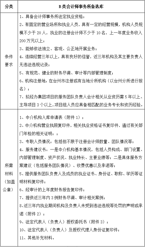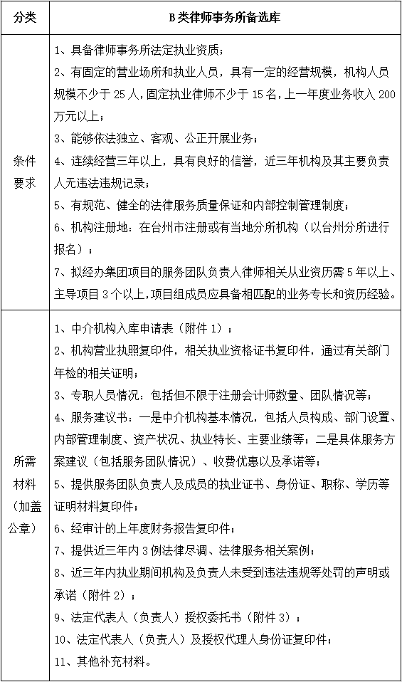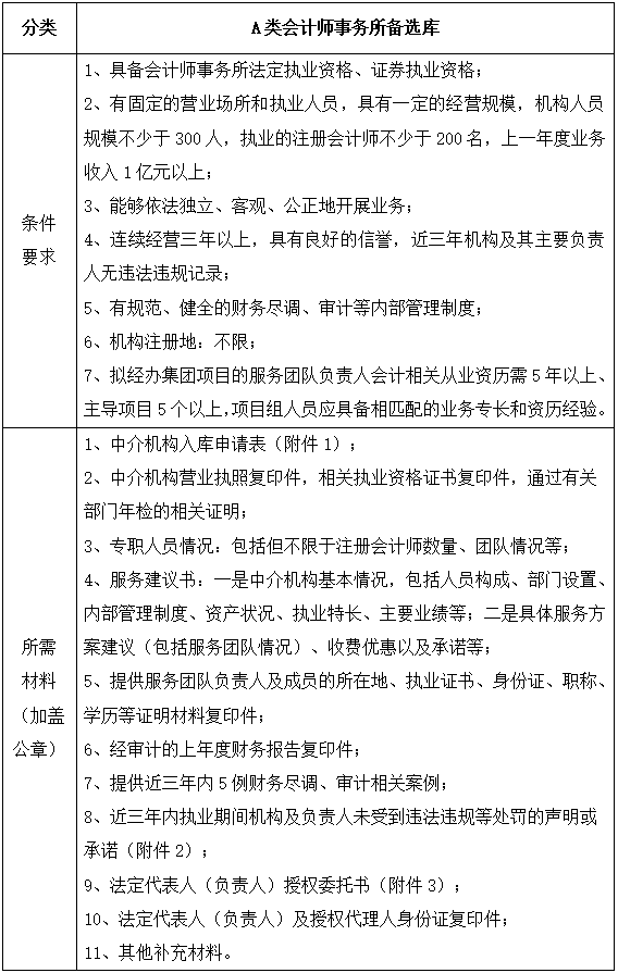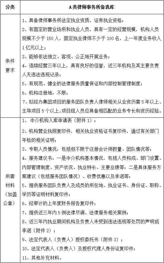 為更好的滿足集團(tuán)財務(wù)審計(jì)、財務(wù)盡調(diào)、法律服務(wù)、法律咨詢等專業(yè)服務(wù)需求,集團(tuán)擬對會計(jì)師事務(wù)所、律師事務(wù)所備選庫開展中介機(jī)構(gòu)入庫申報選聘工作,現(xiàn)將有關(guān)事項(xiàng)公告如下: