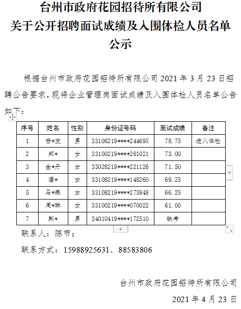 臺(tái)州市政府花園招待所有限公司關(guān)于公開(kāi)招聘面試成績(jī)及入圍體檢人員名單公示