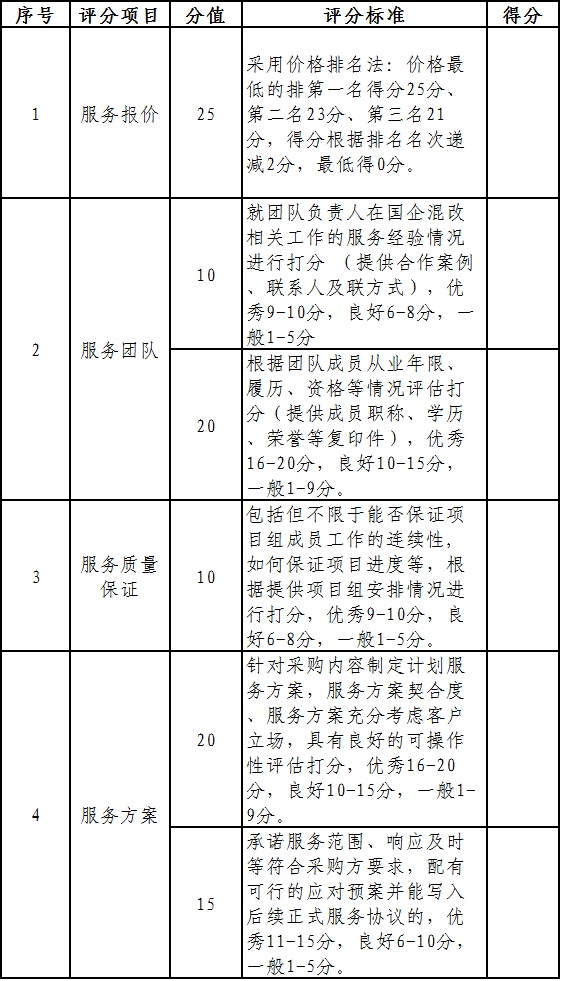 信息發(fā)布后由集團確定評審小組,組織采購評審,確定成交供應(yīng)商。擬采用詢比采購方式進行評審,具體見下列評分表,根據(jù)評審結(jié)果,擇優(yōu)選擇專業(yè)中介機構(gòu)。