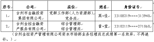 根據2023年4月27日發(fā)布的《臺州市金融投資集團有限公司及所屬企業(yè)公開招聘7名工作人員的公告》要求,經公開報名、面試、體檢和考察等程序,確定以下人員為擬錄用人員,現(xiàn)公示如下: