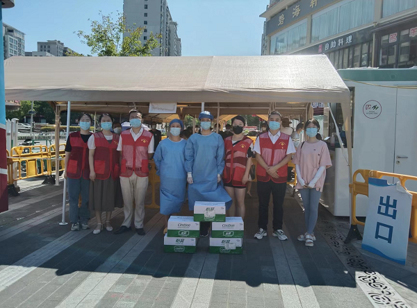 家住廣廈社區(qū)的何女士,因丈夫患有腎衰竭,2019年做了腎移植手術(shù),需要長期服藥和照顧,家里收入甚微,支部黨員們?yōu)檫@個困難家庭購買了生活物資。隨后,大家來到核酸檢測點(diǎn),天氣持續(xù)高溫給核酸采樣的工作人員們帶來了不小的挑戰(zhàn),支部黨員們?yōu)椤耙痪€戰(zhàn)疫”人員送上礦泉水,向“一線戰(zhàn)疫”人員致敬。